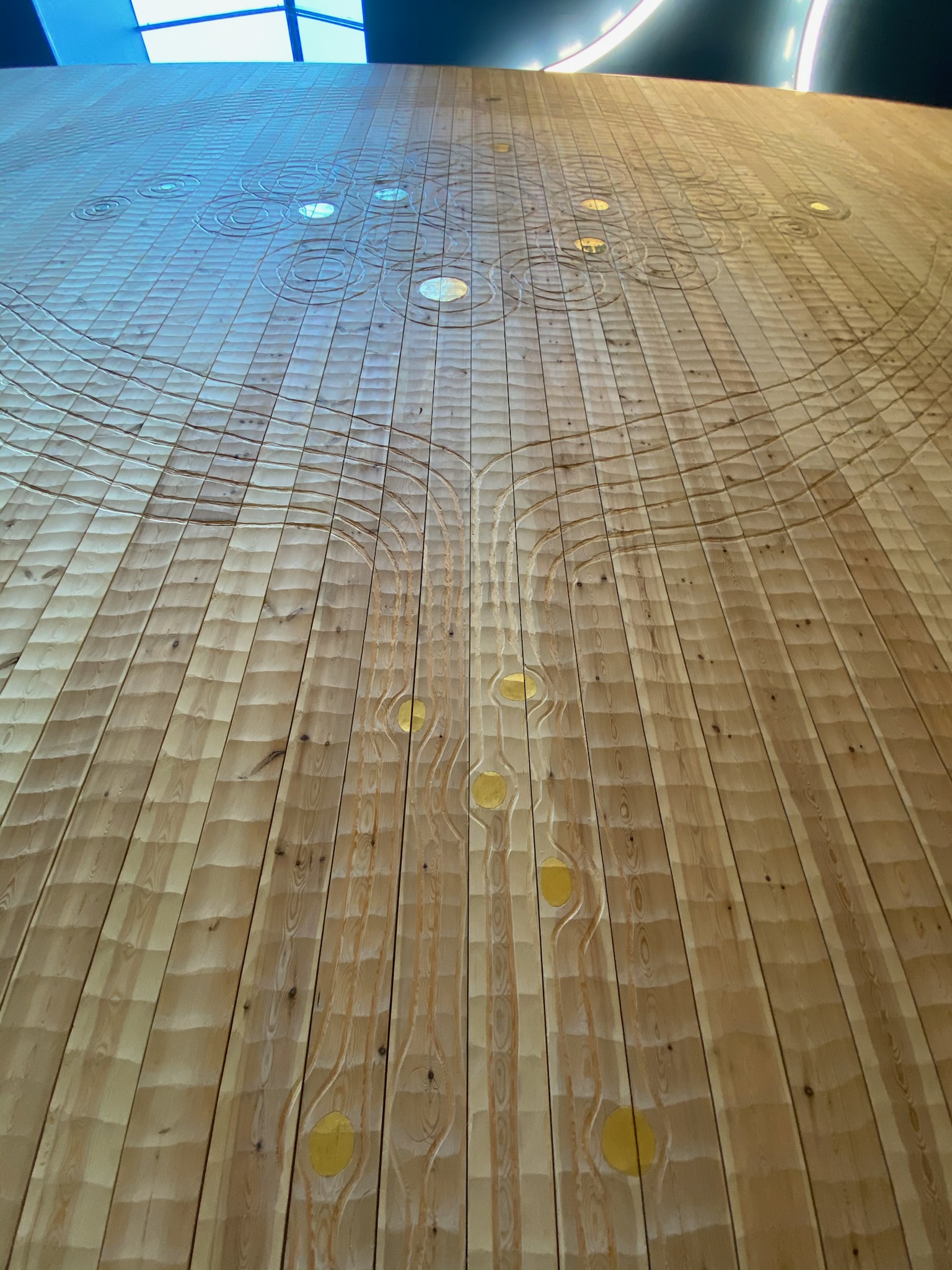 As part of the art acquisitions for the Central Finland Central Hospital, massive hidden plank walls were constructed, onto which the artist Pasi Karjula carved his piece titled “Lähde”. The outer wall of the auditorium is made of hidden planks measuring 177×45 mm. It is a continuous wall that is 14 meters wide and 10 meters high, opening up to the central corridor of the hospital.