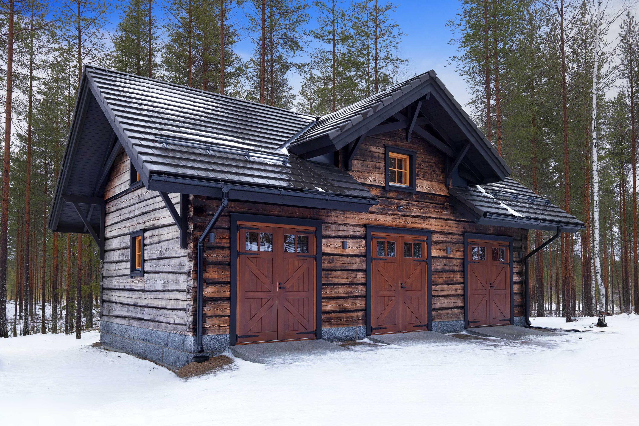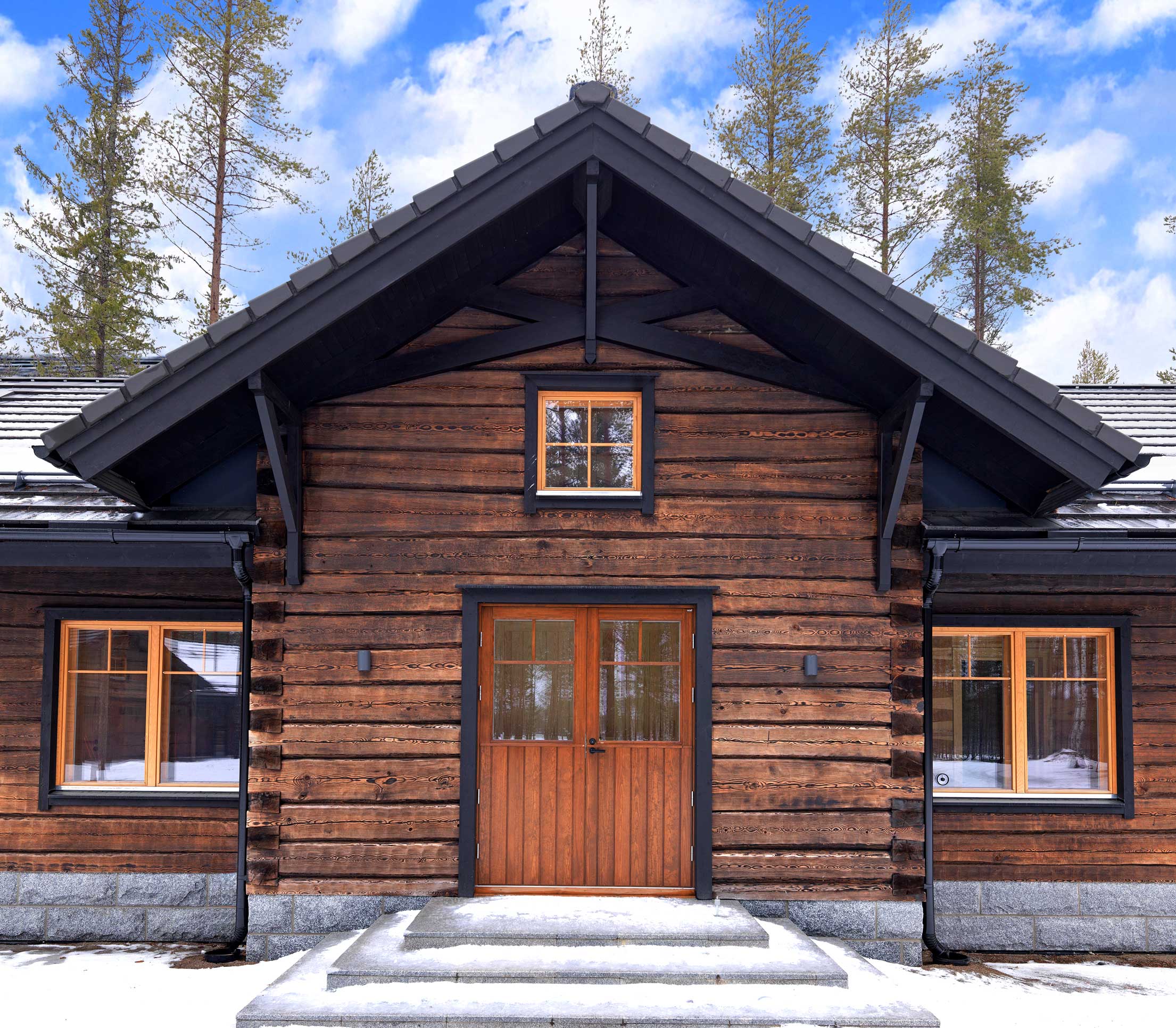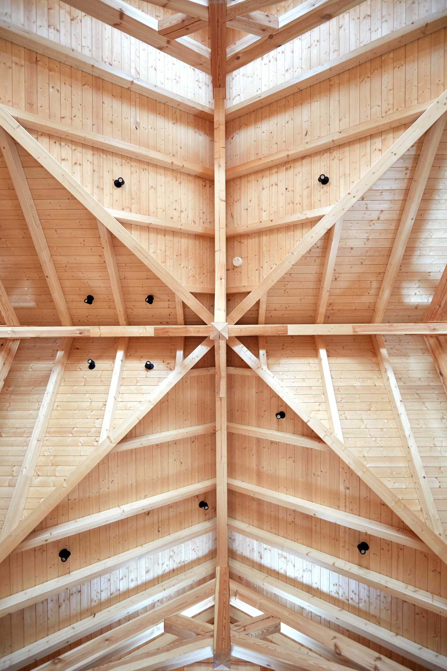 The exteriors of the log structures have been charred and brushed to achieve a dark, refined tone. The timber frame construction technique is expressed both inside and out. All the roofs are built with massive wooden post-and-beam structures using traditional scissor trusses.