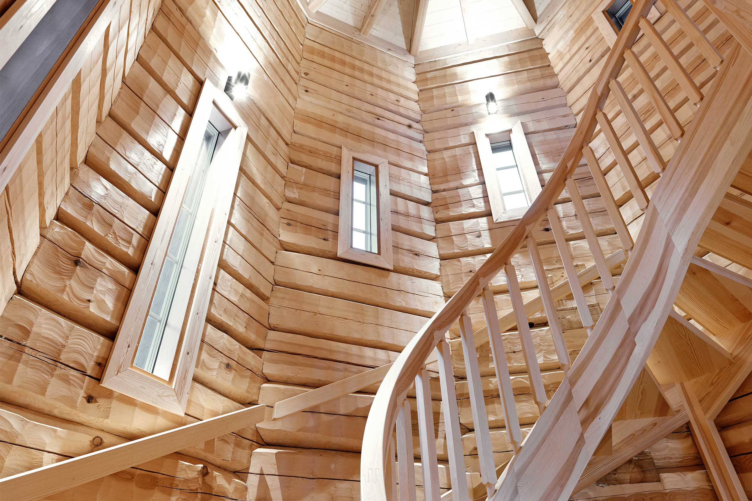Inside, the smooth-planed log surfaces are left in their natural bright wood finish, complemented by large windows that let natural light flood the rooms. The atmosphere throughout is harmonious and warm.