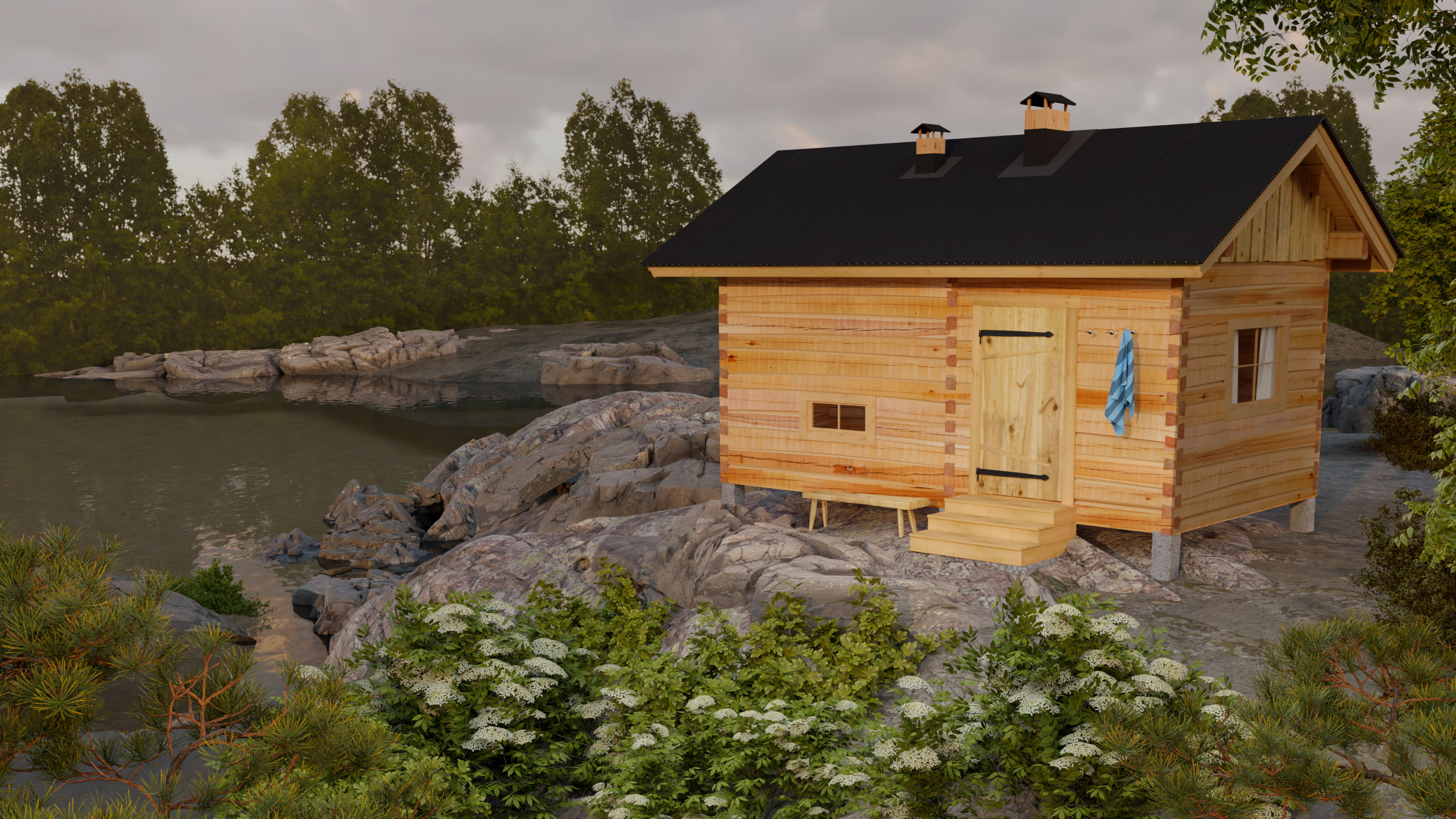 Aune, that consists of a smoke sauna and a dressingroom/lounge, can be size-wise constructed in a traditional Ostrobothnian way as a smoke sauna with back wall benches. Aune also has a washing bench on the window wall, opposite to the sauna stove. The water is heated using iron buckets that are placed on the benches. The log-walled dressing room is furnished with plank benches that skirt the walls, and on the wall, there is a row of pegs designed for hanging your clothes. A table placed in the middle of the room makes the space more comfortable. The foyer is enclosed which makes the sauna more comfortable to use during autumn and winter times. In Aune, some of the smoke caused by heating flows through the sauna door to the dressing room where it is conducted straight up to the roof with the help of a special plank horn. The outside surfaces of Aune can be treated the same way as Kaarina.
