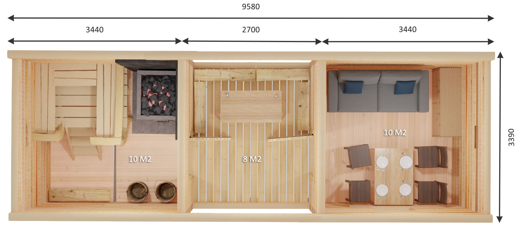 Jalmari is the largest smoke sauna cabin in our collection. Like in all of our smoke saunas, it has a spacious sauna and washroom with Savonia-style benches. In addition, and unlike in our other sauna models, Jalmari has about nine-square-foot terrace leading to a separate lounge that is perfectly suitable for, for example, accommodation.