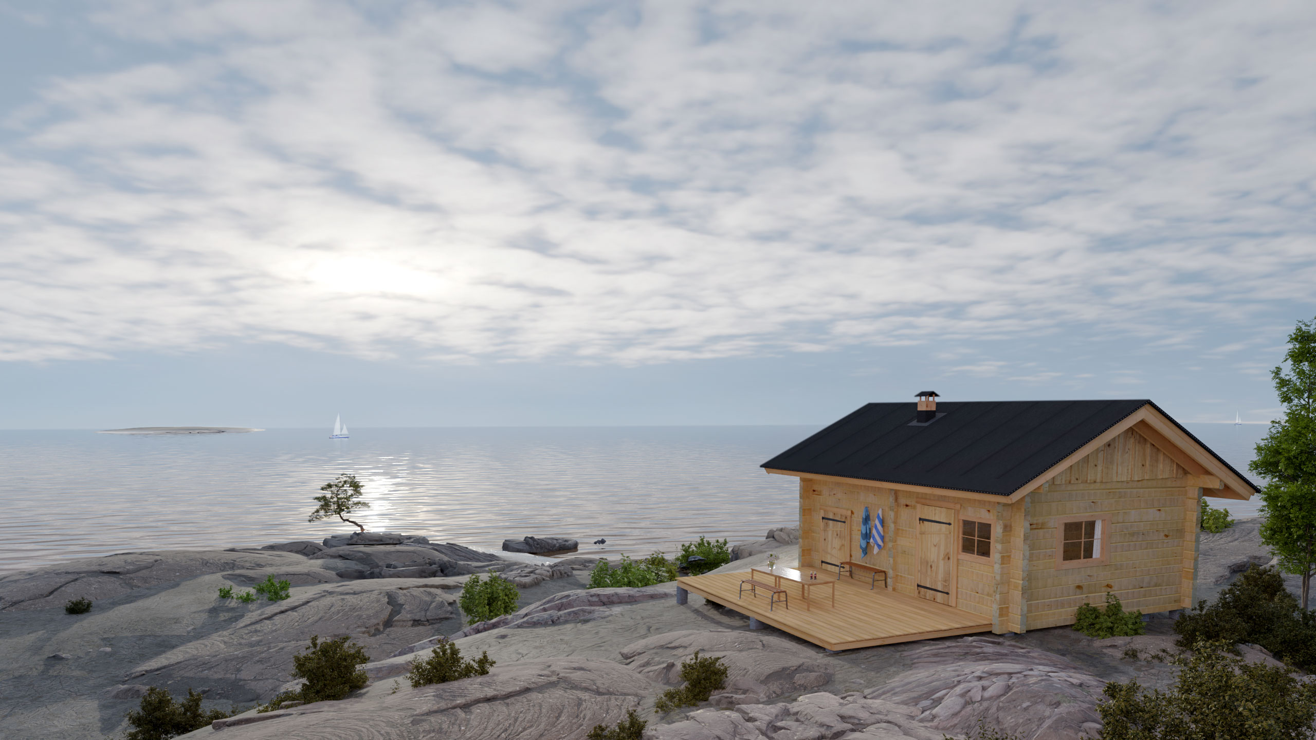 The floor design of Kaarina is based on an old Ostrobothnian sauna building tradition where high, platform-like, benches are located on the rear wall. You can rest your feet on the wide bench during bathing. The washing bench, with water basins, is located on the window wall, opposite to the sauna stove. It is possible to place a heatable water pot next to the sauna stove for heating the water. The extended dressing room of Kaarina also enables accommodation. The space is big enough for two beds or bunk beds, a closet or small kitchenette and a four person dining table. The package also includes a roofed terrace in front of the sauna and a roofed storage slot for fire wood on the back wall. The walls of Kaarina are built from hand-carved log that is at least 150 millimetres thick. The visible surfaces are wave-carved. Outer surfaces are treated with nearly black tar-linseed oil paint Roslag mahogany or grey iron sulphate. The outer surfaces can also be left untreated when they will weather as years go by.