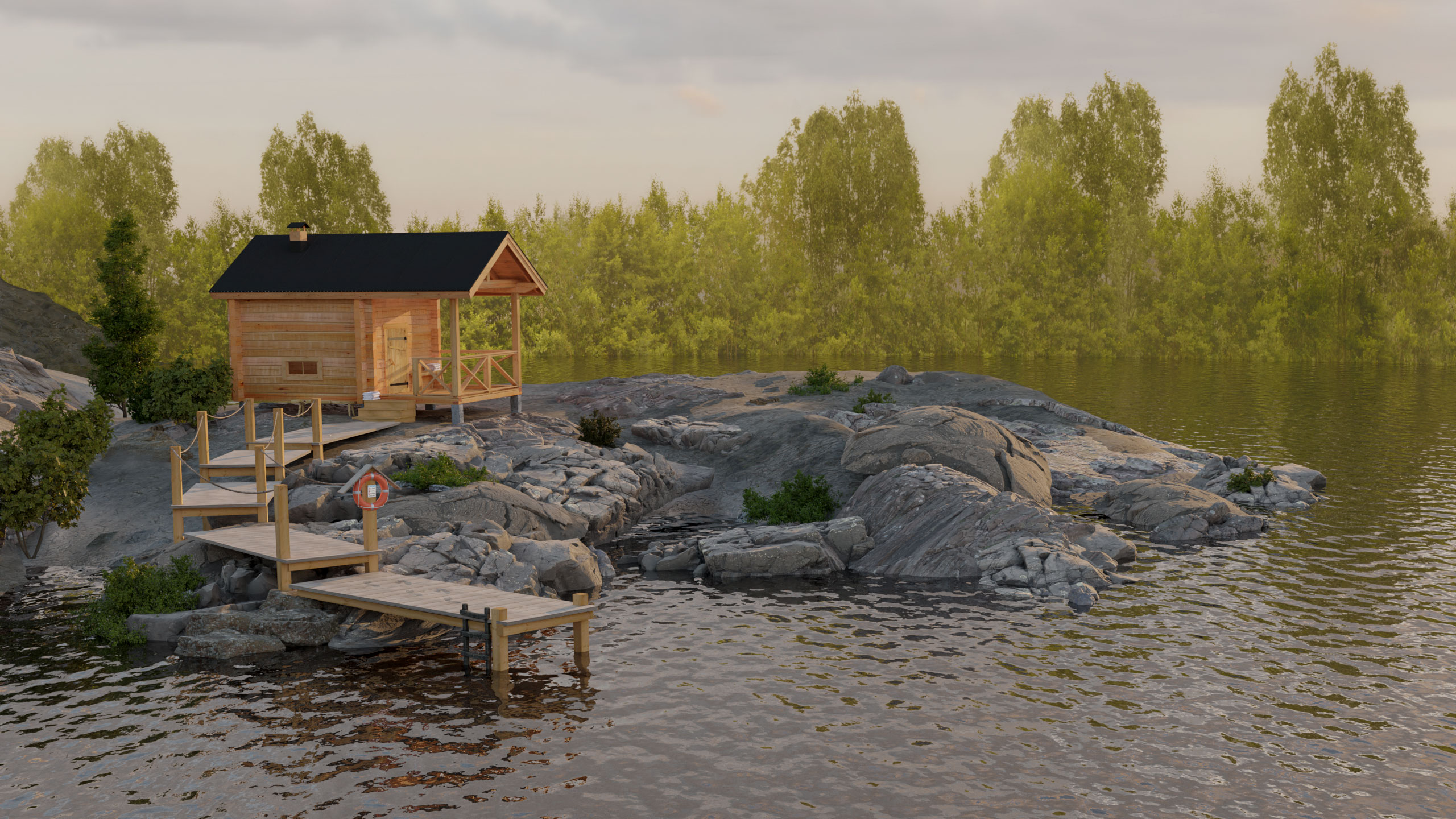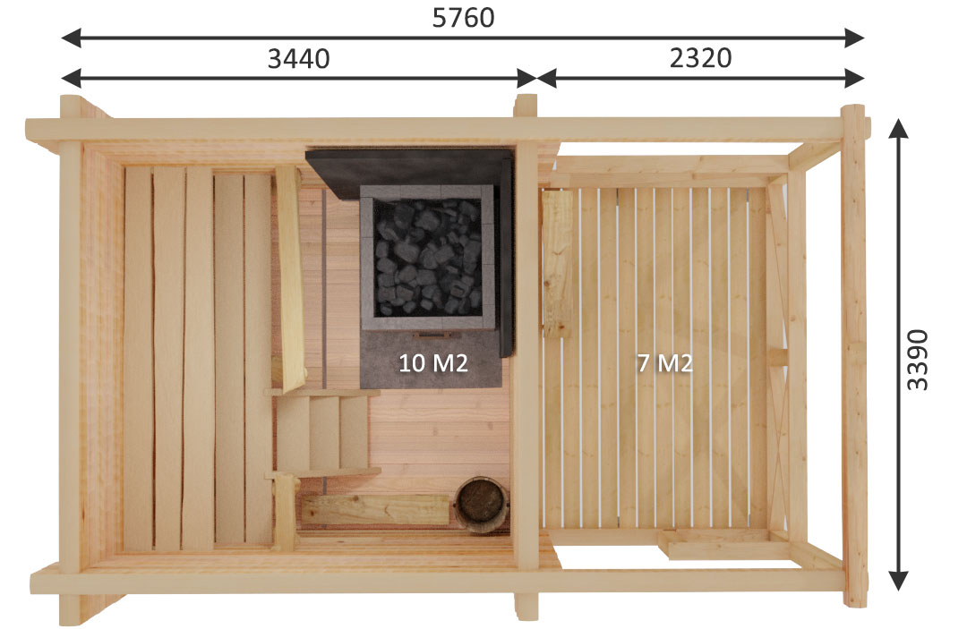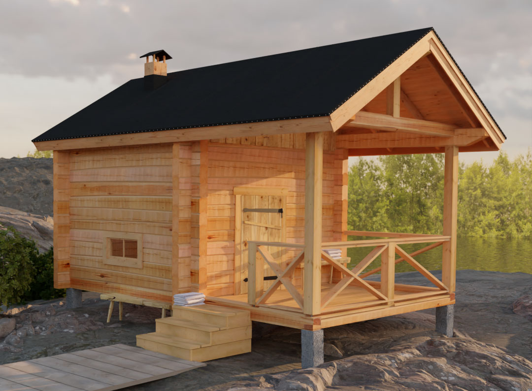 Space-wise the Martti model is like the big brother of Vihtori. Martti has the same size sauna room and the same benches as Vihtori. In addition, Martti has a terrace that can be used as a dressing room and cooling off space. The side walls of the terrace can be left open or they can be clad with, for example, waney-edge boards that complement the sauna’s overall style.