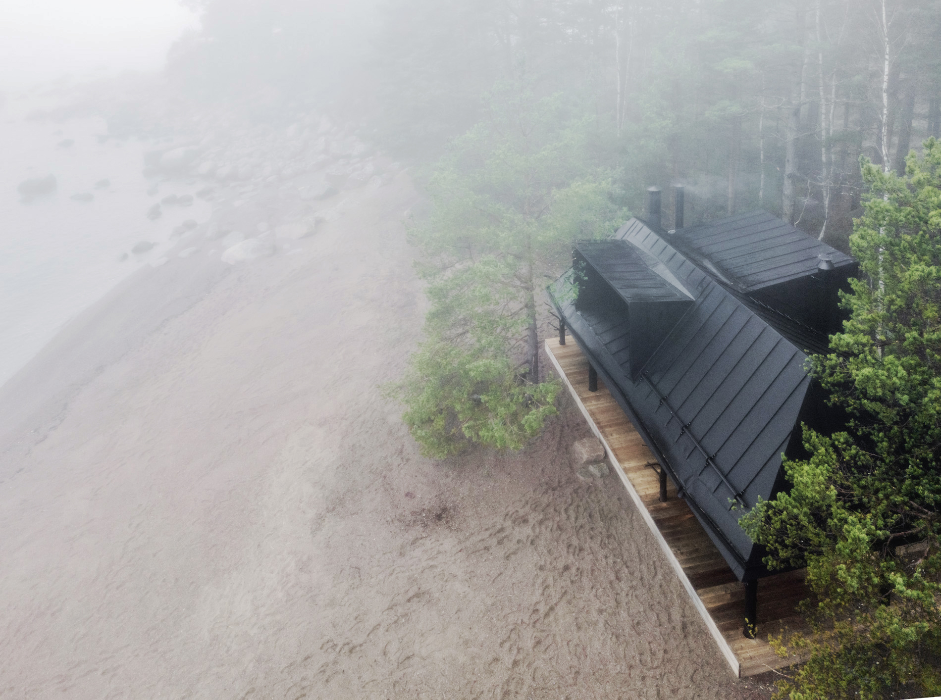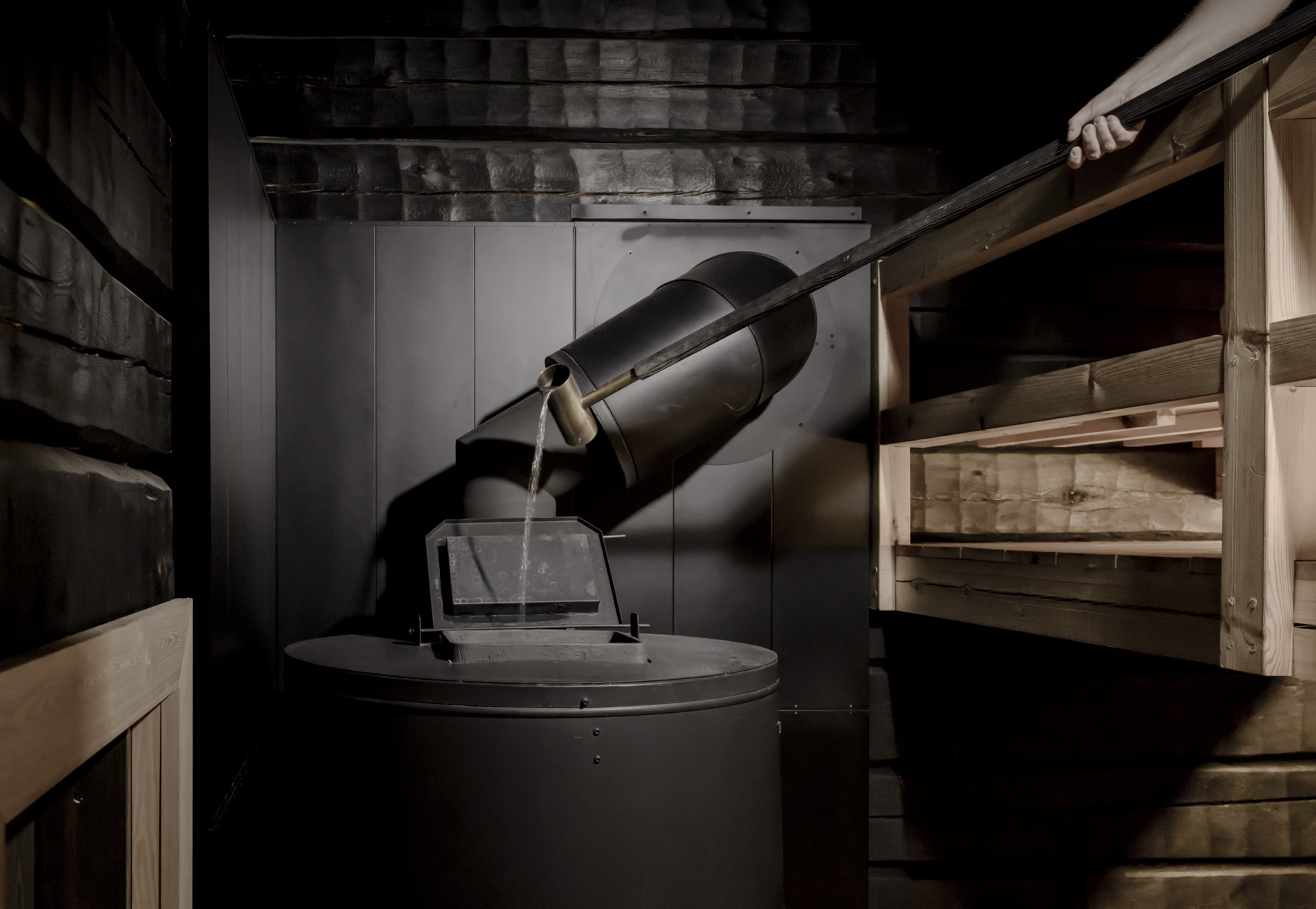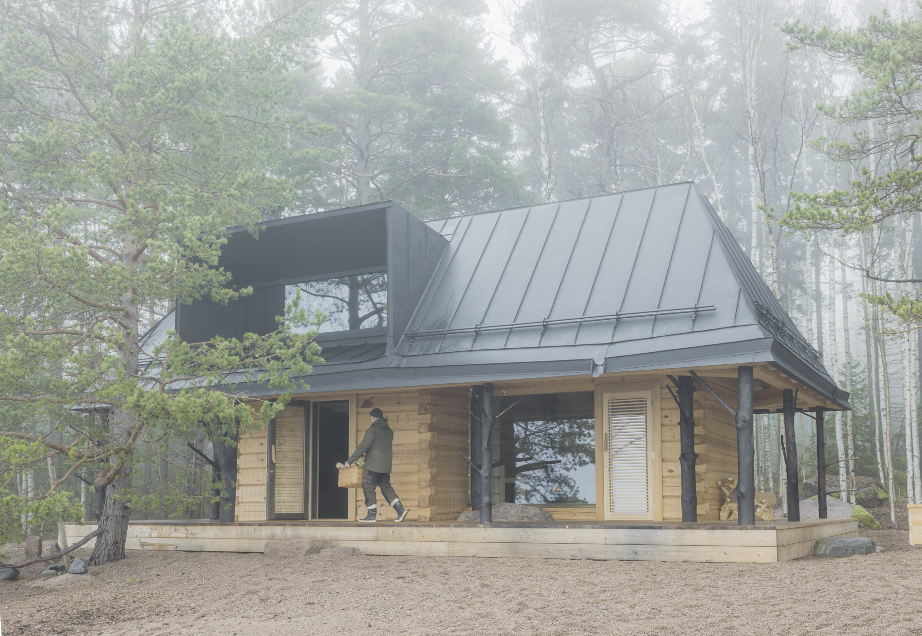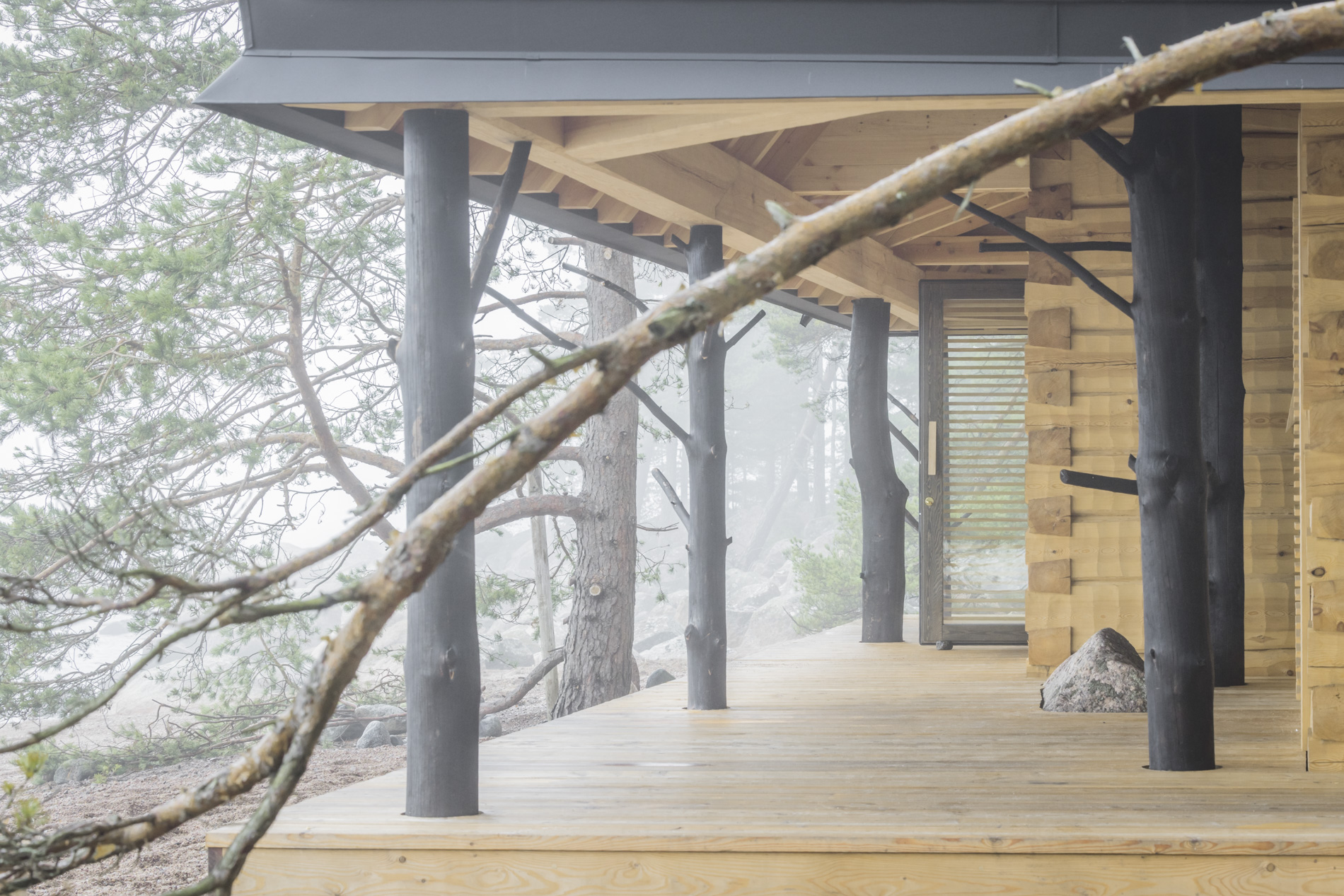 Jo ulkopuolelta katsottuna saunan omaleimaisuus on ilmeinen: katse kiinnittyy ensimmäisenä oksaisiin ja hiiltyneisiin puunrunkoihin, jotka kannattelevat rakennuksen kolmelle sivulle levittyvää katettua terassia. Luonnon muovaamia runkoja löytyy myös sisätiloista, joissa ne ovat olennainen osa saunan ilmettä ja tunnelmaa.